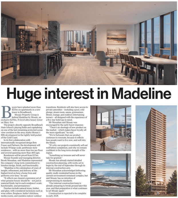 Published via Gold Coast Bulletin Real Estate Guide – 5/07/25 – Buyers have splashed more than $125m on apartments in a new tower in Broadbeach. Mosaic Property Group is behind Madeline by Mosaic, an exclusive $270m, 35-level ultra-luxury tower on Mary Ave.